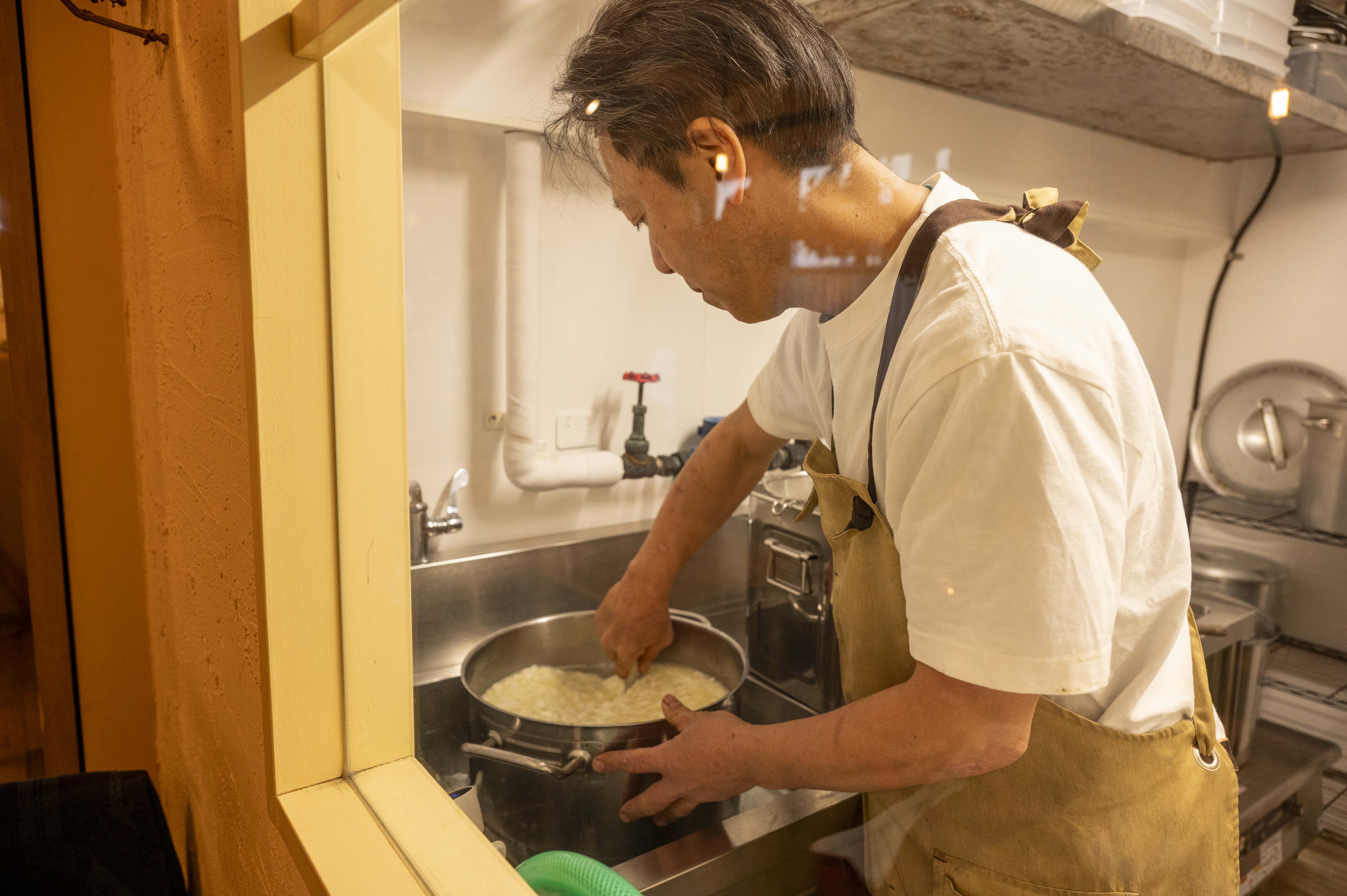 プーリアの食文化に傾倒する高桑氏がとりわけ力を入れるのが、自家製のチーズづくりだ。修業時代に働いた美食の街チェリエ・メッサーピカの「チブス リストランテ」は立派なチーズ工房を備え、熟成庫には熟成期間が5年を超えるようなカチョカヴァロがごろごろしていたという。独立後もつくって店で提供していたが、コロナ禍を機に店内に工房を設置して免許を取得し、「カゼイフィーチョ」(チーズ工房)をオープンした。東京の八王子にある「磯沼ミルク牧場」のミルクを使って、モッツァレラ、ストラッチャテッラ、ブッラータ、リコッタにくわえ、モッツァレラを乾燥させたスカモルツァや白カビ、青カビまで。