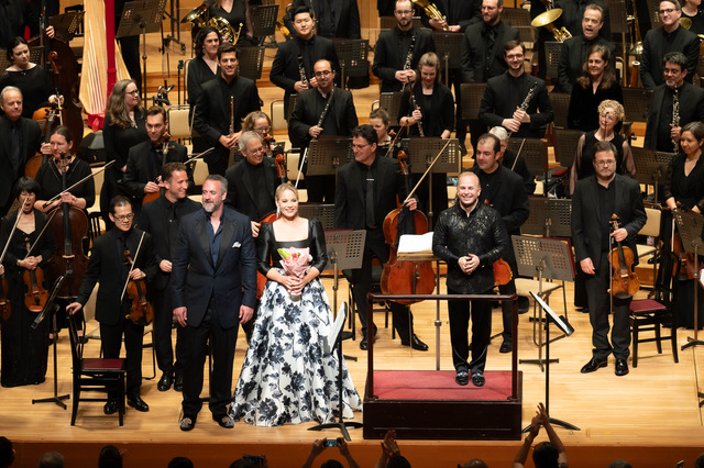 バルトークの歌劇「青ひげ公の城」を演奏後、観客の拍手にこたえる指揮者のネゼ=セガン(右)と