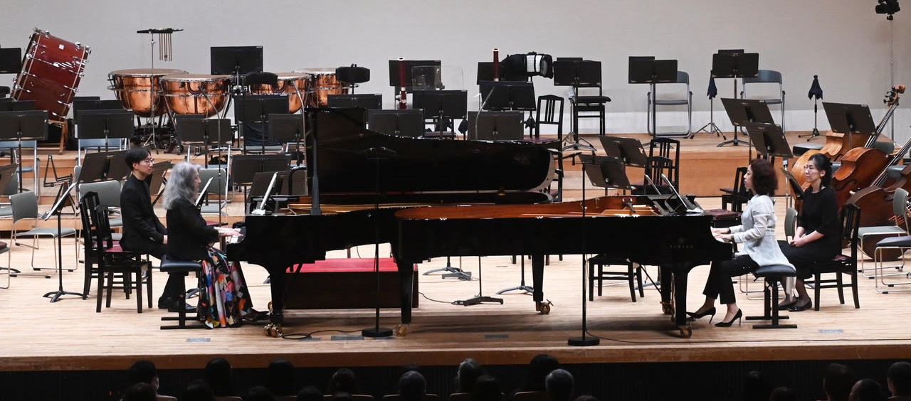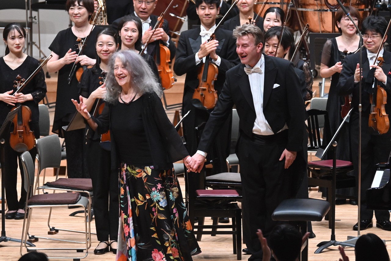 前半にはYouTube上で「Cateen(かてぃん)」の名称とともに人気がブレイク、クラシックのピアニストとしても世界規模で活躍する角野隼斗がアルゲリッチの得意曲、プロコフィエフの「ピアノ協奏曲第3番」を弾き、さらに長く信頼関係にある酒井茜とアルゲリッチが2台のピアノで同じ作曲家の「古典交響曲」をユーモアたっぷりに演奏した。