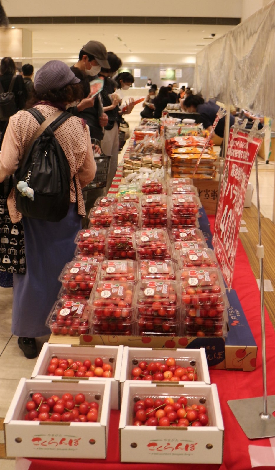 山響は毎年6月、県特産の果物の季節に東京と大阪で「さくらんぼコンサート」を開く。2022年6月22日の東京オペラシティコンサートホール、阪指揮の同コンサートでも、即売コーナーに多勢の人が集まった。