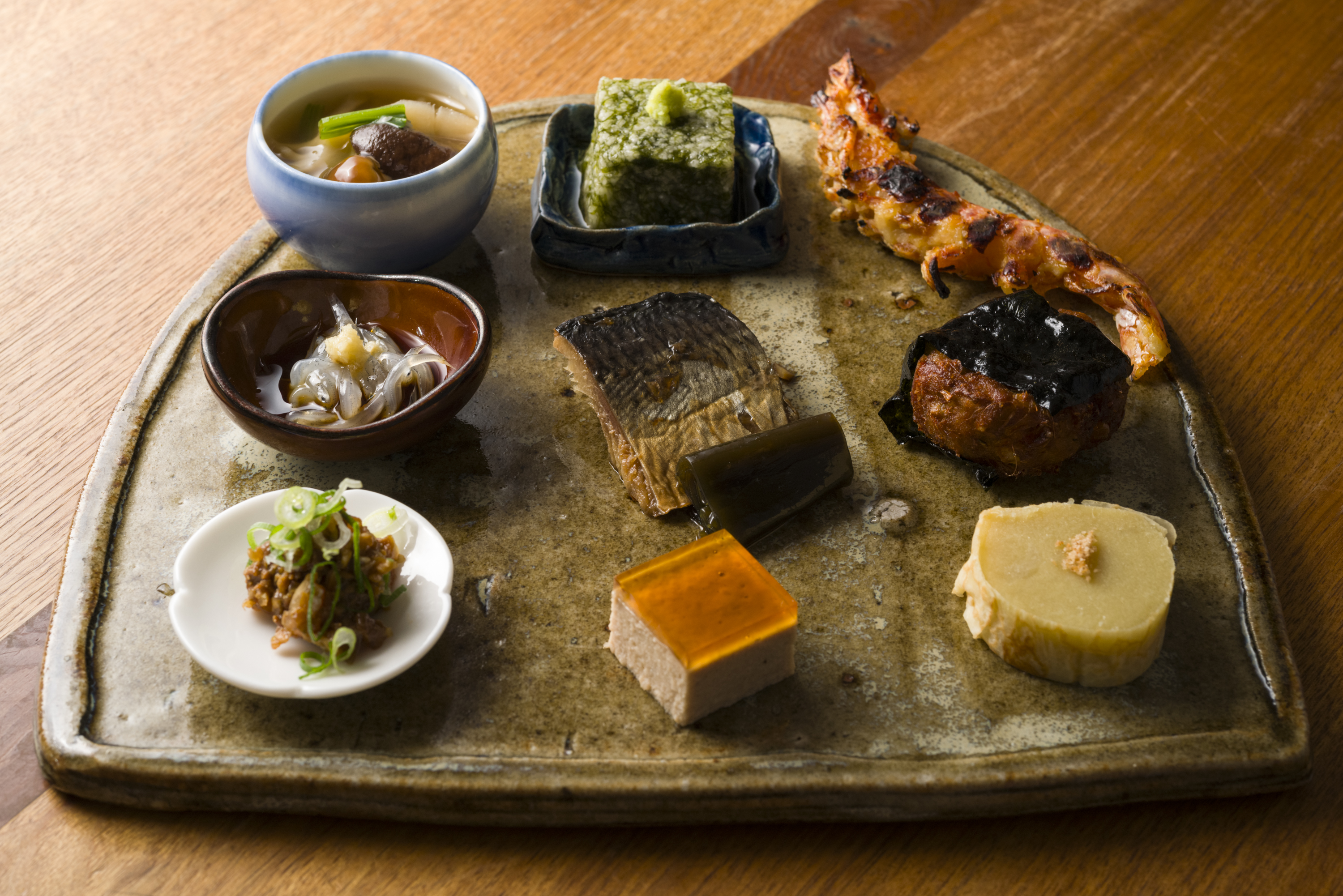 続いて前菜8点盛り(じっさいは9点盛り)だ。定番は海老と味噌の濃厚な味わいが合体した才巻海老味噌焼き、蕎麦前と言えばのニシン煮、ざくっとした食感、こうばしい風味の桜海老の磯部揚げ。そこに季節の品がくわわる。今回は生シラス、アジのなめろう、カモの煮凍り、キノコと蕎麦の実のおひたし、青海苔の常用寄せ、サツマイモのクレープだ。